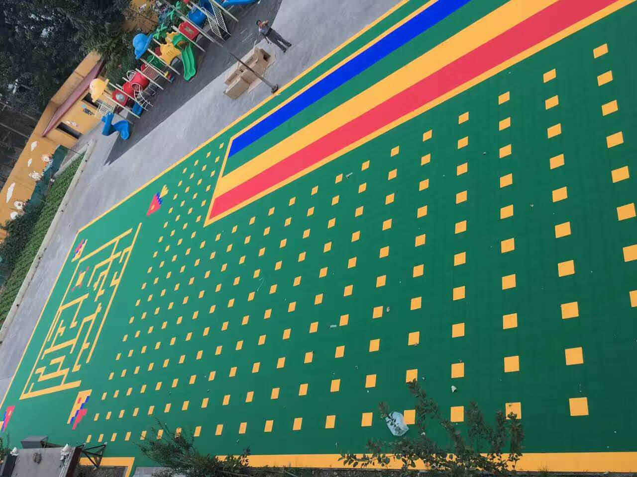 2、根據場地的大小和形狀可以設計豐富多彩的圖案,如跑道,做操需要的站位點,小型的籃球場,足球場等,功能性和色彩兼備,所以備受老師和小朋友的喜愛。